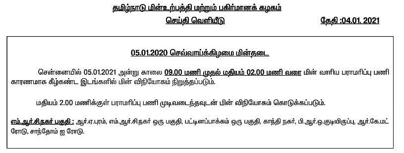 அந்த அறிவிப்பில், சென்னையில் ஜனவரி 5-ம் தேதி அன்று காலை 9 மணி முதல் மதியம் 2 மணி வரை மின் வாரிய பராமரிப்புப் பணிகள் காரணமாக கீழ்க்கண்ட இடங்களில் மின் விநியோகம் நிறுத்தப்படும்.