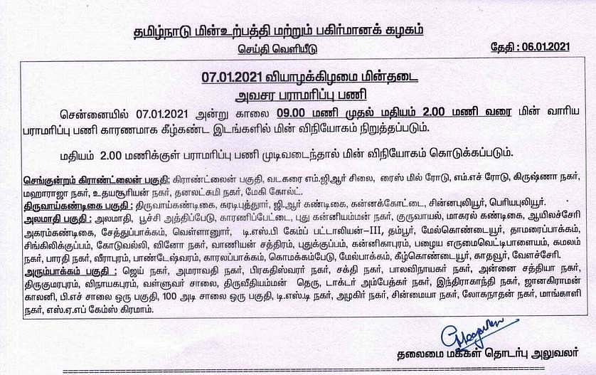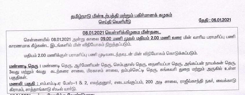 அந்த அறிவிப்பில், சென்னையில் ஜனவரி 7 மற்றும் 8-ம் தேதி அன்று காலை 9 மணி முதல் மதியம் 2 மணி வரை மின் வாரிய பராமரிப்புப் பணிகள் காரணமாக கீழ்க்கண்ட இடங்களில் மின் விநியோகம் நிறுத்தப்படும்.