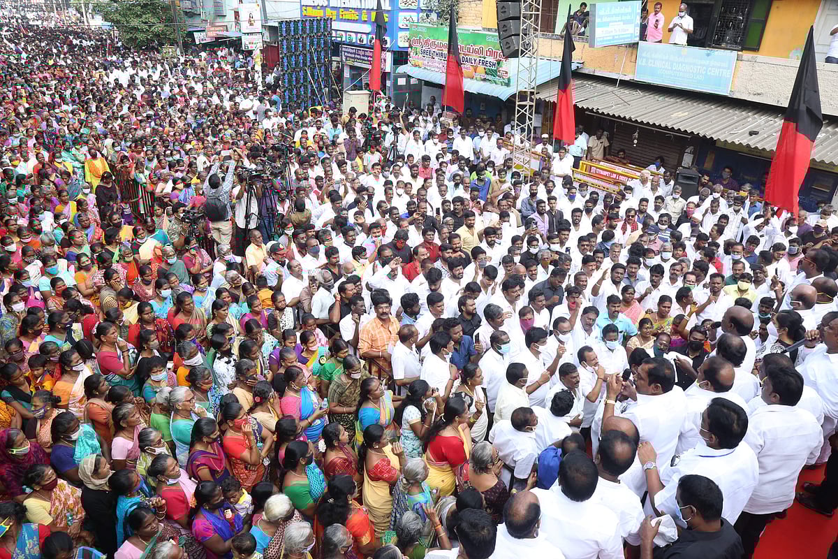 சென்னை: 'வேளச்சேரியா? வெள்ளச்சேரியா?' எனும் வினாவோடு கண்டன ஆர்ப்பாட்டம் சென்னை தெற்கு மாவட்ட திமுக சார்பில் இன்று காலை வேளச்சேரி காந்தி சாலையில் நடைபெற்றது.
