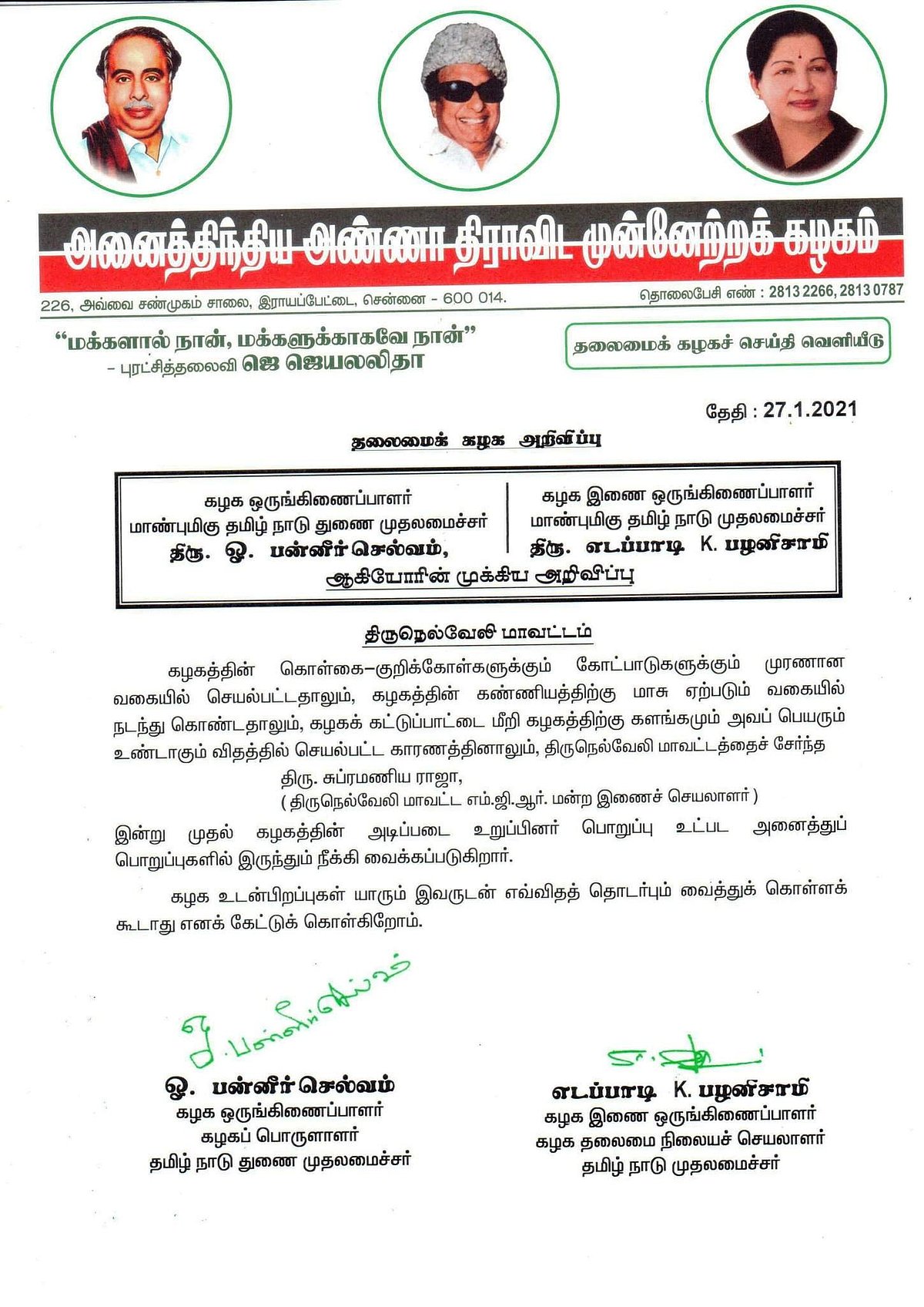 சசிகலாவை வரவேற்று போஸ்டர் ஒட்டிய திருநெல்வேலி மாவட்ட அதிமுக நிர்வாகி சுப்பிரமணிய ராஜா, கட்சியின் அடிப்படை உறுப்பினர் உள்ளிட்ட அனைத்து பொறுப்புகளிலிருந்தும் நீக்கப்பட்டுள்ளதாக அதிமுக அறிக்கை வெளியிட்டுள்ளது.