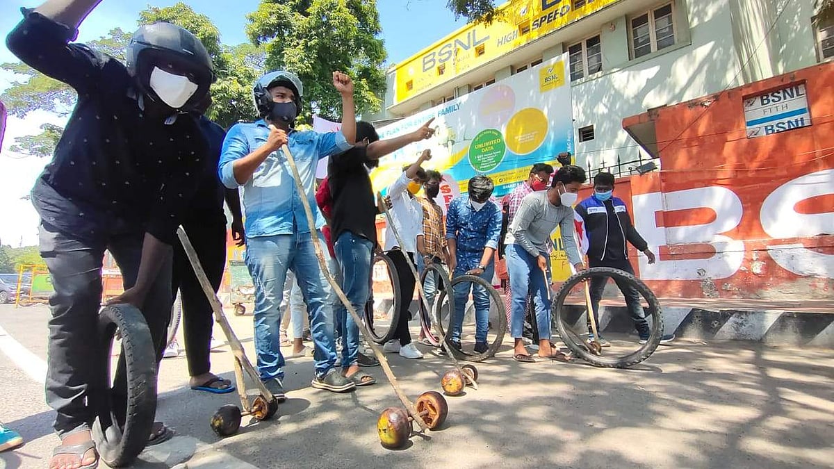 பெட்ரோல், டீசல் விலை உயர்வைக் கண்டித்து இந்திய மாணவர் சங்கத்தினர் தலையில் ஹெல்மெட் அணிந்தபடி சைக்கிள் டயரை உருட்டிக்கொண்டும், நுங்கு வண்டி உருட்டிக் கொண்டும் கோவையில் நூதனப் போராட்டத்தில் ஈடுபட்டனர்.