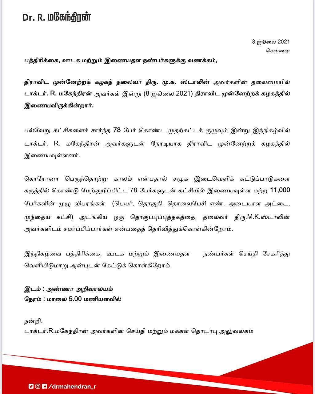 மக்கள் நீதி மய்யம் கட்சியிலிருந்து விலகிய மகேந்திரன் உள்பட 78 பேர் இன்று திமுகவில் இணைகிறார்கள்.