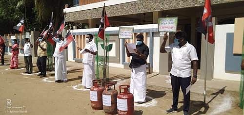 சீர்காழி முன்னாள் எம்.எல்.ஏ.வுமான பி .வி. பாரதி தனது இல்லத்திற்கு முன்பாக குடும்பத்தினருடன் ஆர்ப்பாட்டம் நடத்தினார்.
