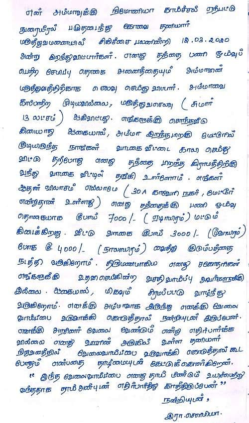 "இரா. சௌமியா ஆகிய நான் பி.இ. கணினி அறிவியல் பட்டதாரி, எனது தந்தை ஆவின் ஓய்வு பெற்ற பணியாளர்.என்னுடன் பிறந்த மூத்த சகோதரிகள் இரண்டு பேர் இவர்களுக்கு திருமணம் ஆகிவிட்டது. எனது தந்தை பணியில் இருந்து பெற்ற சம்பளத்தொகை அனைத்தையும் எங்களை படிக்க வைக்கவும் சகோதரிகளுக்கு திருமணம் செய்யவும் செலவு செய்து விட்டார். நாங்கள் மூன்று பெண்களும் பட்டதாரிகள் ஆனால், வேலை வாய்ப்பு கிடைக்கவில்லை.எனது தந்தை பணி ஓய்வு பெற்று வந்த சில மாதங்களில் என் அம்மாவுக்கு நிமோனியா காய்ச்சல் ஏற்பட்டு நுரையீரல் பழுதடைந்து கோவை தனியார் மருத்துவமனையில் சிகிச்சை பலனின்றி 12 .03 .2020 அன்று இறந்து விட்டார்கள்.