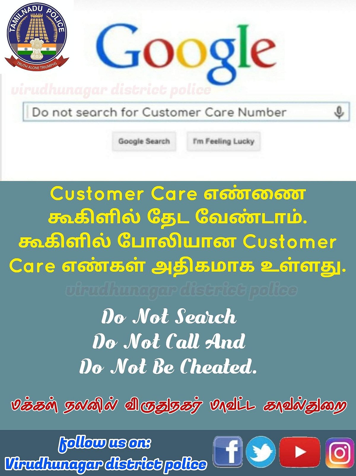 எந்த ஒரு நிறுவனத்தின் வாடிக்கையாளர் சேவை எண்ணையும் கூகுளில் தேட வேண்டாம் என்று காவல்துறை தரப்பில் எச்சரிக்கை விடுக்கப்பட்டுள்ளது.
