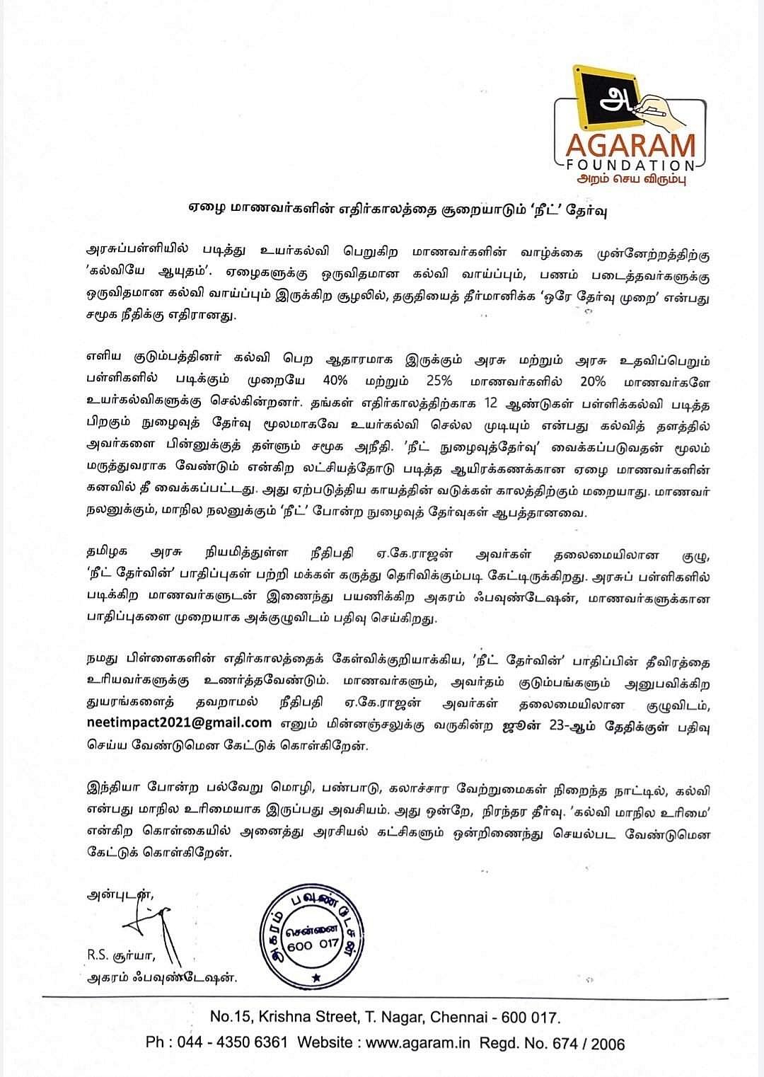 நீட் தேர்வின் பாதிப்பின் தீவிரத்தை, நீதிபதி ஏ.கே. ராஜன் தலைமையிலான குழுவிடம் ஜூன் 23-ஆம் தேதிக்குள் பதிவு செய்ய வேண்டும் என நடிகரும், அகரம் அறக்கட்டளை நிறுவனருமான சூர்யா கேட்டுக் கொண்டுள்ளார்.