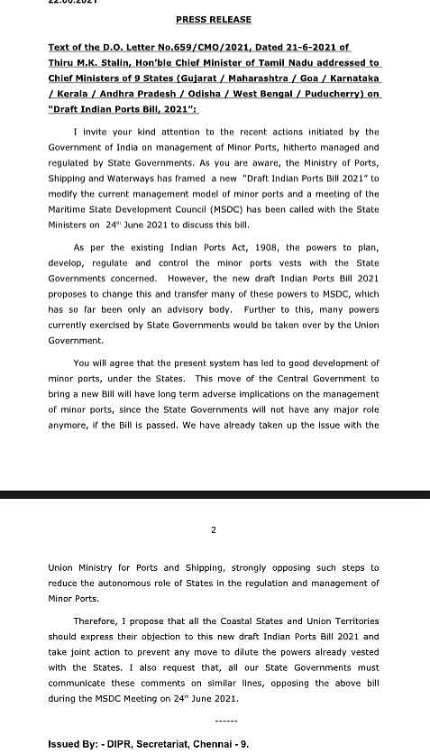 எனவே, அனைத்து கடலோர மாநிலங்களும், யூனியன் பிரதேசங்களும் இந்திய துறைமுகங்கள் 2021 சட்ட வரைவு மசோதாவுக்கு ஆட்சேபனைகளைத் தெரிவிக்குமாறு கேட்டுக் கொள்கிறேன். தமிழகம் உள்பட கடலோர மாநிலங்கள் அனைத்தும் கூட்டாக சேர்ந்து எடுக்கும் நடவடிக்கையே, இந்த சட்ட வரைவு மசோதாவை அடுத்தக் கட்ட நகர்வுக்குக் கொண்டுச் செல்லாமல் தடுக்கும். எனவே அனைத்து மாநிலங்களும் இது தொடர்பாக ஒருவருக்கு ஒருவர் தொடர்பு கொண்டு தகவல்களை பரிமாறிக் கொள்ளவும், வரும் 24ஆம் தேதி நடைபெறும் அமைச்சர்கள் அளவிலான கூட்டத்தில், இந்த சட்ட வரைவு மசோதாவுக்கு கடும் எதிர்ப்பினை பதிவு செய்யவேண்டும் என்றும் கேட்டுக் கொள்கிறேன் என்று மு.க. ஸ்டாலின் வலியுறுத்தியுள்ளார்.