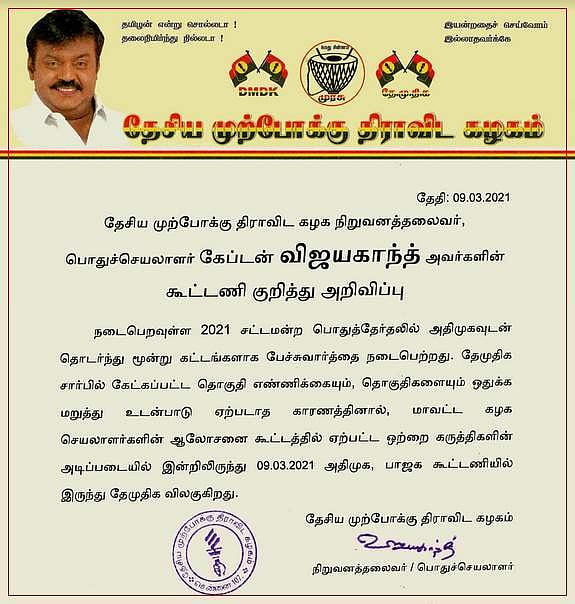 தேசிய முற்போக்கு திராவிட கட்சியின் நிறுவனத்தலைவர், பொதுச்செயலாளர் விஜயகாந்த், கூட்டணி குறித்து வெளியிட்ட அறிவிப்பில், நடைபெறவுள்ள 2021 சட்டமன்ற பொதுத்தேர்தலில் அதிமுகவுடன் தொடர்ந்து மூன்று கட்டங்களாக பேச்சுவார்த்தை நடைபெற்றது. தேமுதிக சார்பில் கேட்கப்பட்ட தொகுதி எண்ணிக்கையும், தொகுதிகளையும் ஒதுக்க மறுத்து உடன்பாடு ஏற்படாத காரணத்தினால், மாவட்ட செயலாளர்களின் ஆலோசனை கூட்டத்தில் ஏற்பட்ட ஒற்றை கருத்திகளின் அடிப்படையில் இன்றிலிருந்து 09.03.2021 அதிமுக, பாஜக கூட்டணியில் இருந்து தேமுதிக விலகுகிறது என்று தெரிவிக்கப்பட்டுள்ளது.