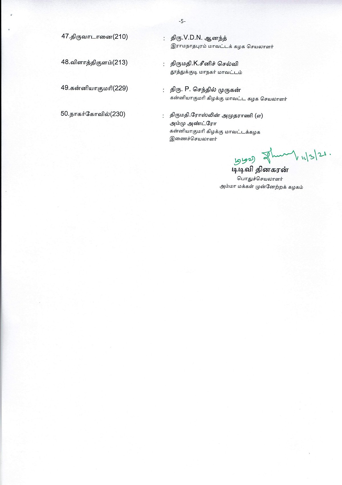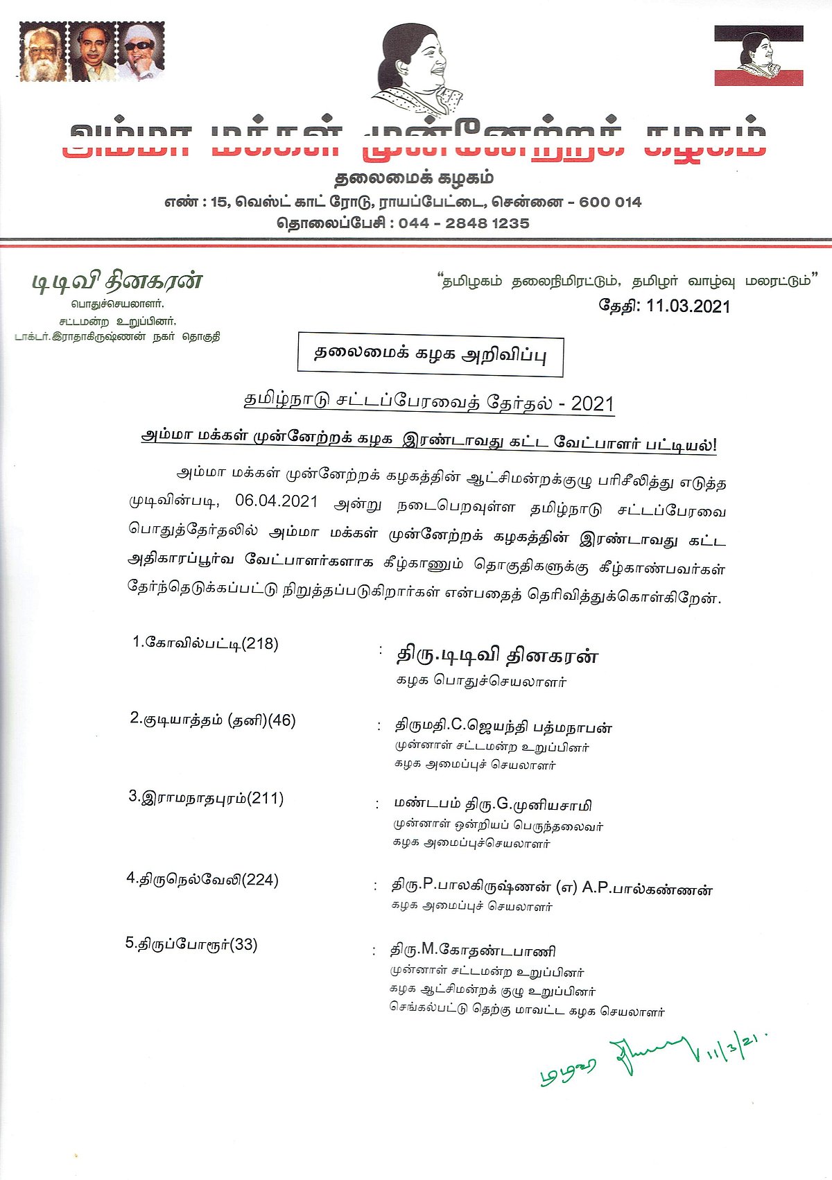 கோவில்பட்டியில் டிடிவி தினகரன் போட்டி: 2ஆம் கட்ட வேட்பாளர் பட்டியல் வெளியீடு