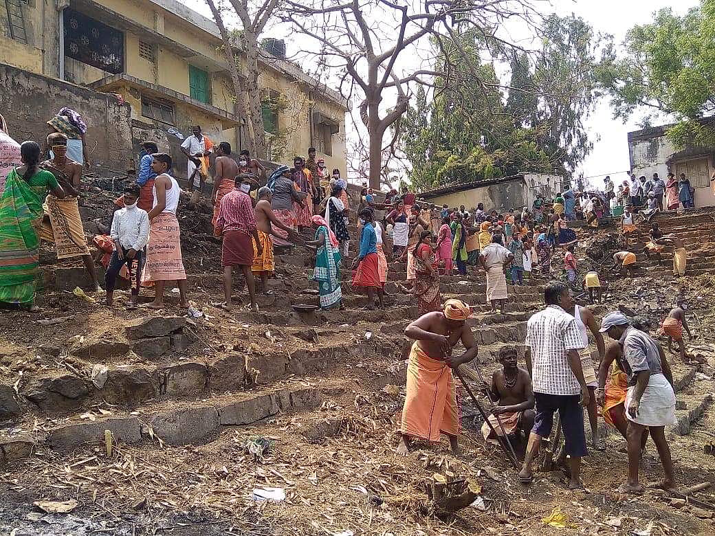 இதனையடுத்து, திருத்தொண்டர் சபை நிறுவனர் ஆர்.ராதாகிருஷ்ணன், கரூர் சரவணன் ஆகியோர் இதனை பார்வையிட்டு சீரமைக்க முடிவு செய்தனர். இதனைத் தொடர்ந்து தேனி, கரூர், சேலம், கடலூர், திருப்பூர், ஈரோடு உள்ளிட்ட தமிழகத்தின் பல்வேறு பகுதிகளிலிருந்து உத்ராட்ச மலை அணிந்த, நெற்றியில் விபூதி பூசியவாறு திரண்ட 300-க்கும் மேற்பட்ட சிவனடியார் தொண்டர்கள் தெப்பக்குளத்தில் இறங்கி தூர்வாரும் உழவாரப் பணியில் ஈடுபட்டனர்.