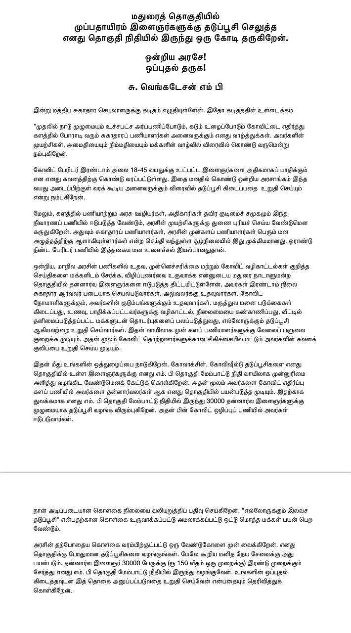 மதுரையில் 30,000 இளைஞர்களுக்கு தடுப்பூசி போடுவதற்கு தொகுதி நிதியில் இருந்து ரூ. 1 கோடி தருவதாகவும் அதற்கு மத்திய அரசு ஒப்புதல் அளிக்க வேண்டும் என்றும் சு.வெங்கடேசன் எம்.பி. தெரிவித்துள்ளார்.