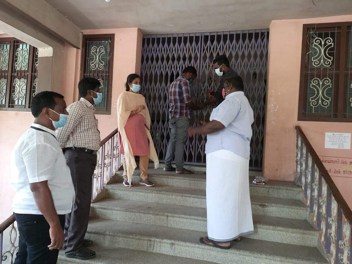 திருவாரூர் மாவட்டம், கூத்தாநல்லூரில் திருமண மண்டபத்திற்கு நகராட்சி ஆணையர் சீல் வைத்து பூட்டினார்.