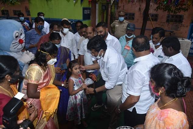சென்னை நுங்கம்பக்கம் ராமா தெருவில் உள்ள நடுநிலைப்பள்ளியில் ஆயிரம் விளக்கு சட்டபேரவை உறுப்பினர் டாக்டர் எழிலன் பள்ளிக்கு வந்த குழந்தைகளுக்கு மலர் கொத்துகள், இனிப்புகள் வழங்கினார்.