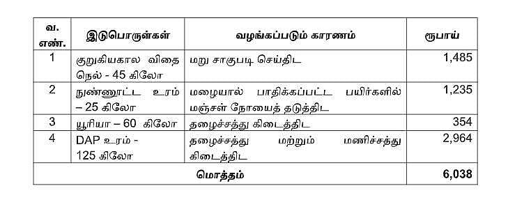 4. டிஏபி (DAP) உரம் 125 கிலோ, தழைச்சத்து மற்றும் மணிச்சத்து கிடைத்திட ரூ.2,964 என மொத்தம் 6,038 வழங்கப்படுகிறது.