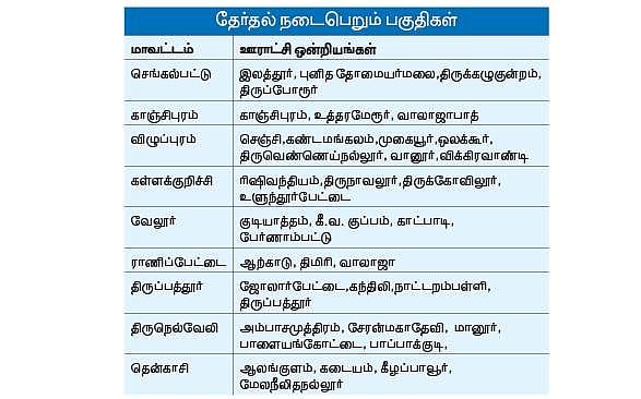 செங்கல்பட்டு, காஞ்சிபுரம், விழுப்புரம், கள்ளக்குறிச்சி, வேலூர், ராணிப்பேட்டை, திருப்பத்தூர், திருநெல்வேலி, தென்காசி ஆகிய 9 மாவட்டங்களில் 27,003 பதவியிடங்களுக்கான ஊரக உள்ளாட்சித் தேர்தலில் முதல் கட்ட வாக்குப் பதிவு புதன்கிழமை(அக்.6) நடைபெற உள்ளது. இத்தேர்தலில் 41 லட்சத்து 93 ஆயிரத்து 996 பேர் வாக்களிக்க உள்ளனர். மொத்தம் இரண்டு கட்டங்களாக நடைபெற உள்ள உள்ளாட்சித் தேர்தலில் மொத்தம் 79,433 வேட்பாளர்கள் களத்தில் உள்ளனர்.
