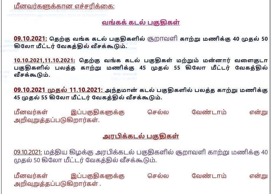 அக். 10.. நீலகிரி, கோவை, கிருஷ்ணகிரி, சேலம், ஈரோடு, அரியலூர், பெரம்பலூர், திருச்சி, மதுரை, புதுக்கோட்டையில் ஓரிரு இடங்களில் இடி மின்னலுடன் கூடிய கனமழையும், ஏனைய மாவட்டங்கள் மற்றும் புதுவை, காரைக்கால் பகுதிகளில் அநேக இடங்களில் இடி மின்னலுடன் கூடிய மிதமான மழையும் பெய்யக் கூடும்.