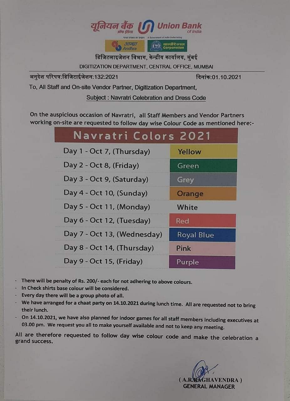 நவராத்திரிக்கு ஒன்பது நாளும் ஒன்பது நிற உடையில் வா. இல்லையென்றால் தண்டம் கட்டு. இது என்ன அரசு வங்கியா அல்லது அதிகாரி வீட்டின் பூஜை அறையா என்று நாடாளுமன்ற உறுப்பினர் சு. வெங்கடேசன் எம்.பி. கண்டனம் தெரிவித்துள்ளார். மேலும் இந்த உத்தரவை உடனயடியாகத் திரும்ப பெற வண்டும் என்றும் வலியுறுத்தியுள்ளார்.