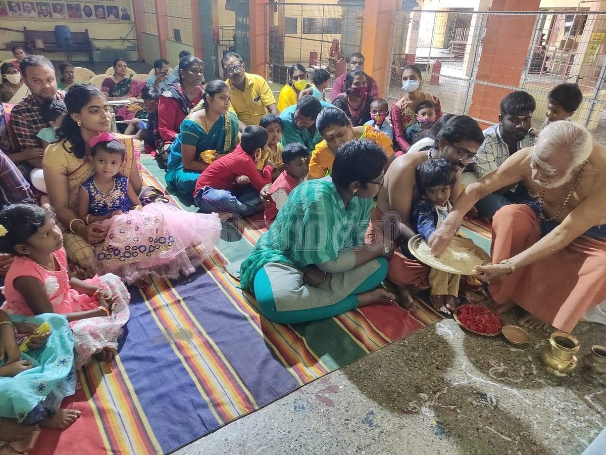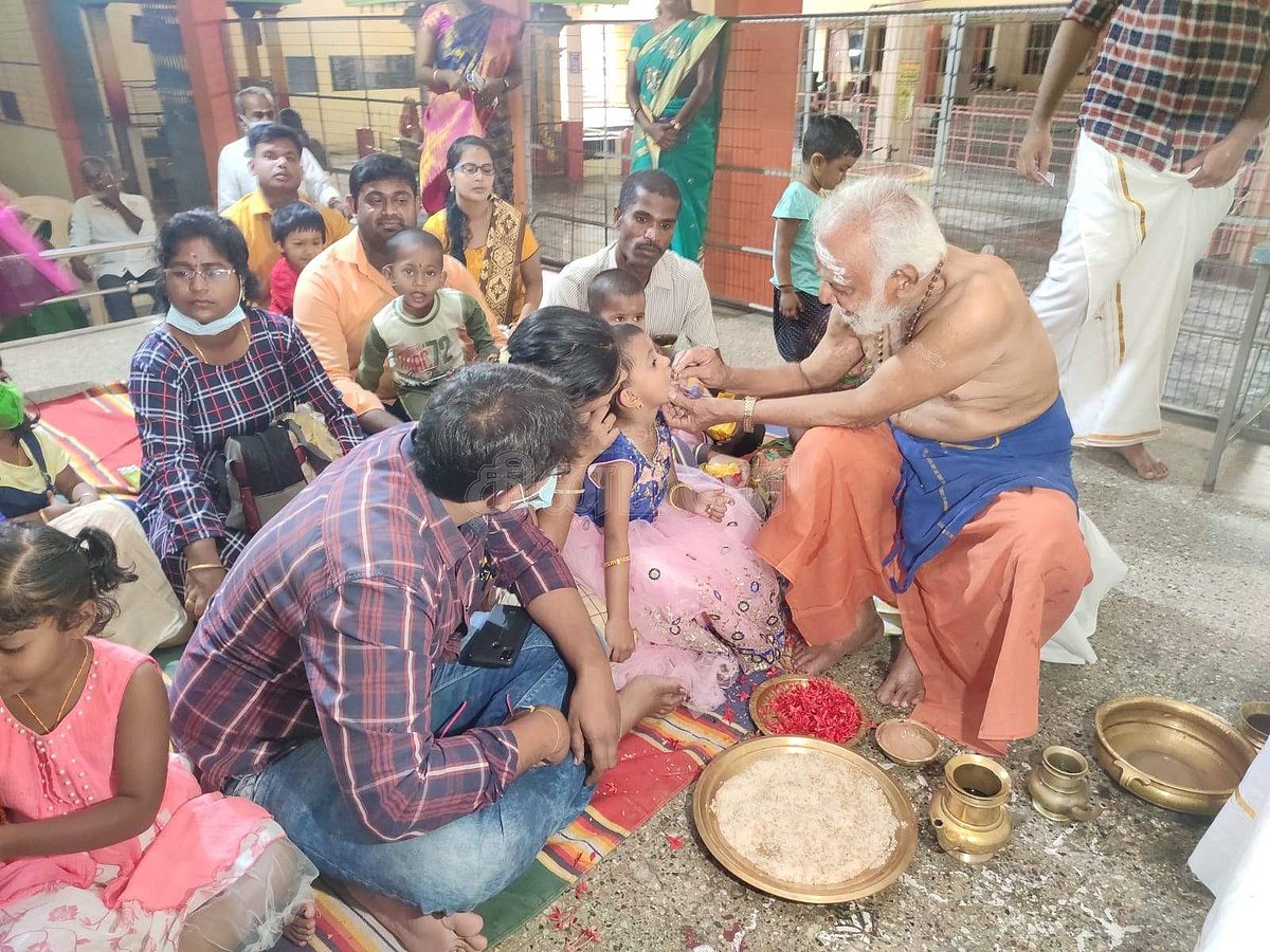 சரஸ்வதி பூஜையையொட்டி கோயிலின் குருக்கள் ஆர். சிவதாஸ், பச்சரிசியில் குழந்தைகளின் விரலைக் கொண்டு ஓம் ஹரி ஸ்ரீ கணபதே நமக என எழுத செய்தார்.