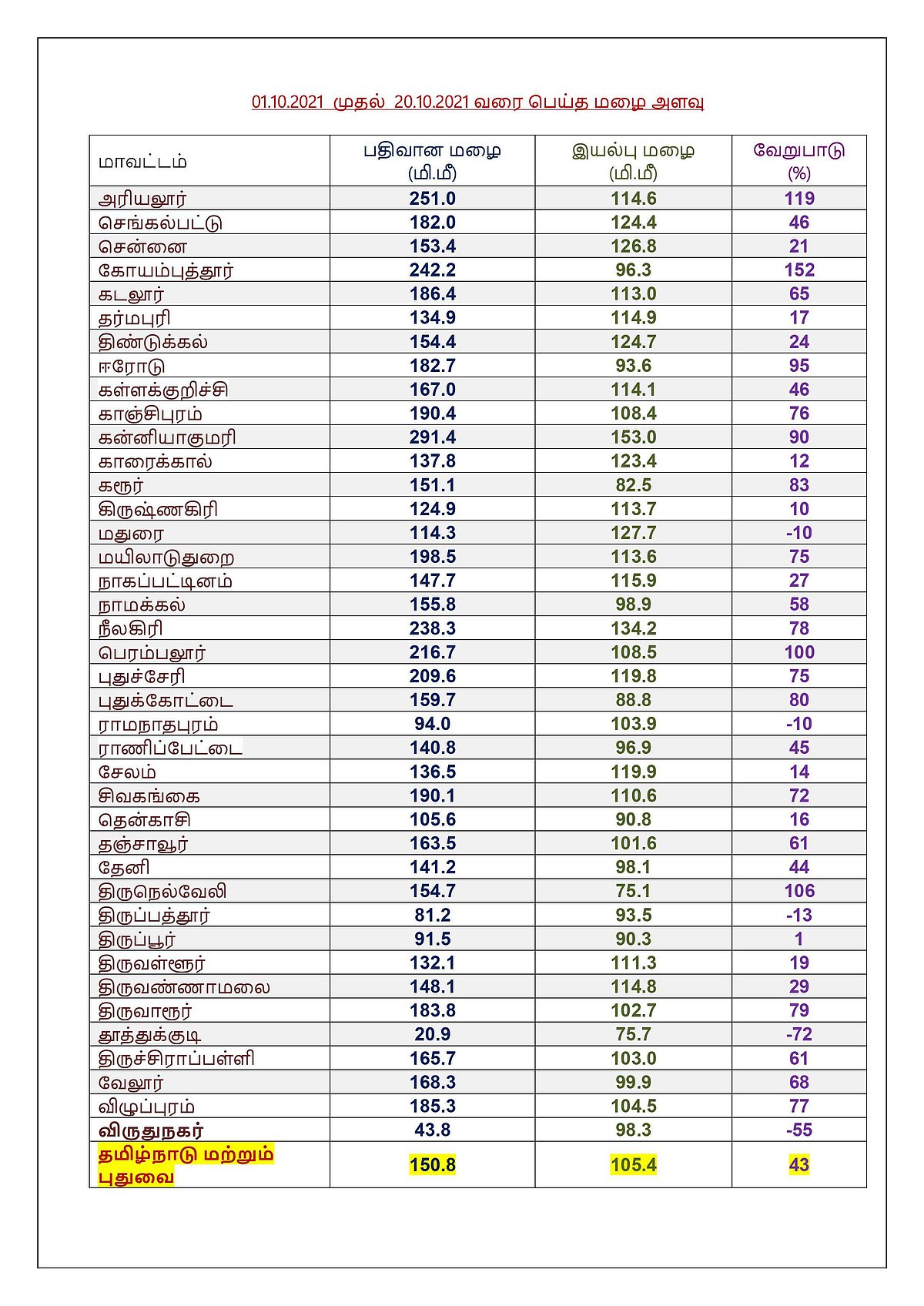 வளிமண்டல மேலடுக்கு சுழற்சி காரணமாக, தமிழகத்தில் அக்டோபர் 20 மற்றும் 21ஆம் தேதிகளில் 22 மாவட்டங்களில் மிக கனமழை பெய்யும் என்று எச்சரித்துள்ளது.