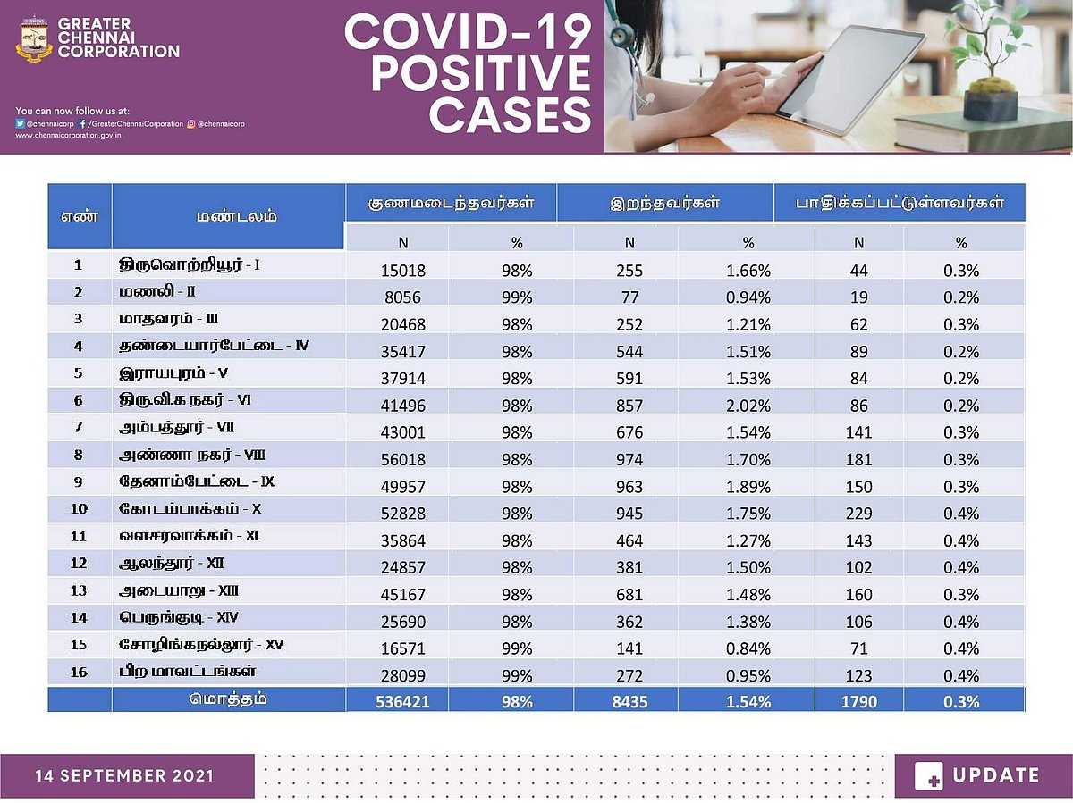 இந்நிலையில் சென்னை மாநகராட்சி இன்று வெளியிட்டுள்ள தகவலில், சென்னையில் இதுவரை மொத்தமாக 5,46,646 பேருக்கு தொற்று உறுதி செய்யப்பட்டுள்ளது.