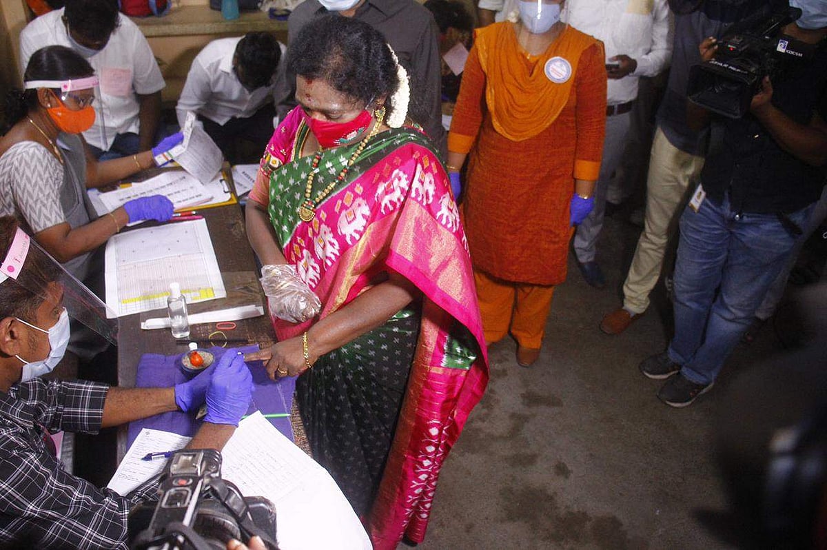 தெலங்கானா ஆளுநரும், புதுவை துணை நிலை ஆளுநருமான (பொ) தமிழிசை சௌந்தரராஜன் இன்று தனது கணவருடன் வந்து ஜனநயாகக் கடமையை ஆற்றினார்.