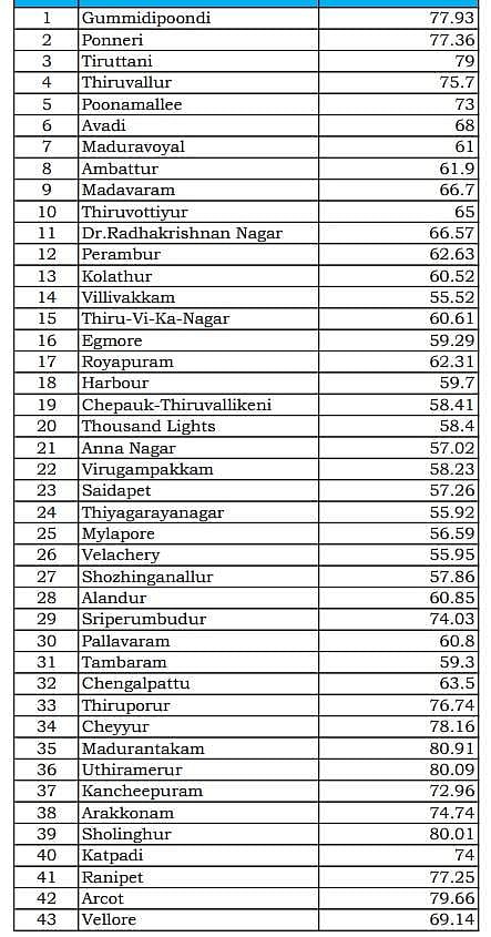 தமிழகத்திலேயே குறைந்தபட்சமாக சென்னை வில்லிவாக்கம் தொகுதியில் 55.52 சதவீத வாக்குகள் பதிவாகியுள்ளன. தமிழகத்தில் மிகக் குறைந்த வாக்குகள் பதிவான தொகுதிகளின் பட்டியலில் கடைசி ஐந்து இடங்களை அண்ணாநகர், மயிலாப்பூர், தி.நகர், வேளச்சேரி, வில்லிவாக்கம் ஆகிய தொகுதிகள் பிடித்துள்ளன.