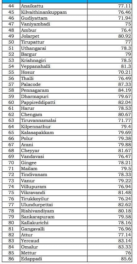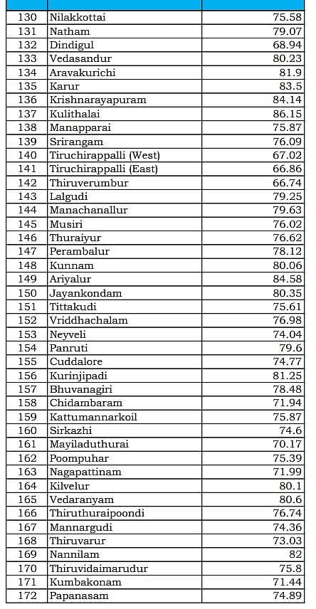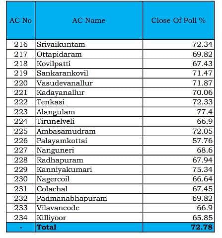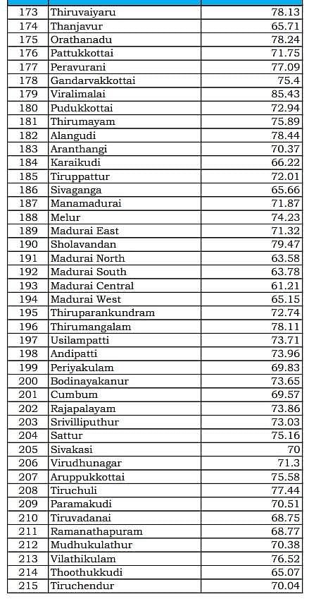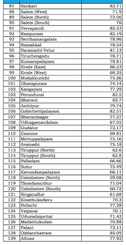 அதன்படி, தமிழகத்தில் ஒட்டுமொத்தமாக 72.78 சதவீத வாக்குகள் பதிவாகியுள்ளன. அதிகபட்சமாக பாலக்கோடு  தொகுதியில் 87.33 சதவீத வாக்குகளும், அதற்கு அடுத்தபடியாக குளித்தலையில் 86 சதவீத வாக்குகளும் பதிவாகியுள்ளது.