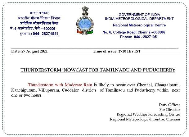 தமிழகம் மற்றும் புதுச்சேரியில் மழை எச்சரிக்கை குறித்து இந்திய வானிலை ஆய்வு மையம் மாலை 5.10 மணிக்கு வெளியிட்டிருக்கும் தகவலில், தமிழகம் மற்றும் புதுச்சேரியில் சென்னை, செங்கல்பட்டு, காஞ்சிபுரம், விழுப்புரம், கடலூர் மாவட்டங்களில் இன்னும் ஒன்று அல்லது இரண்டு மணி நேரத்தில் இடியுடன் கூடிய பலத்த மழை பெய்யும் வாய்ப்பு உள்ளதாக அறிவிக்கப்பட்டுள்ளது.