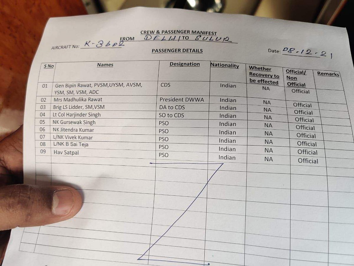 அதாவது தில்லியில் இருந்து சூலூர் சென்ற ஹெலிகாப்டரில் முப்படைத் தலைமை தளபதி விபின் ராவத், அவரது மனைவி மதுலிகா ராவத், லெப்டினன்ட் கர்னல் ஹஜிந்தர் சிங் உள்ளிட்டோர் பயணித்துள்ளனர்.