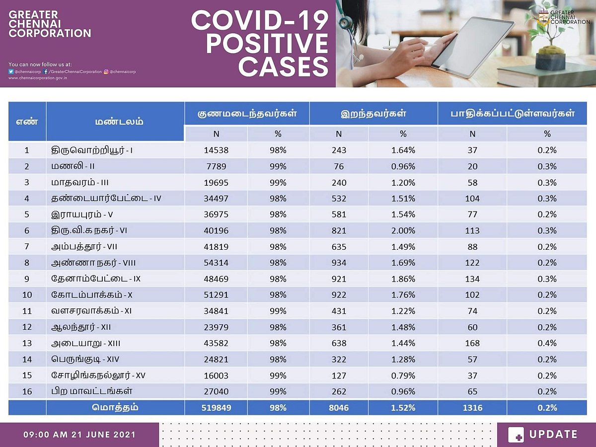 சென்னையில் மொத்த கரோனா பாதிப்பு 5,29,211 ஆக உள்ளது. இதுவரை கரோனாவுக்கு 8,046 பேர் உயிரிழந்துள்ளனர். பாதிக்கப்பட்டோரில் 5,19,849 பேர் குணமடைந்துள்ளனர்.