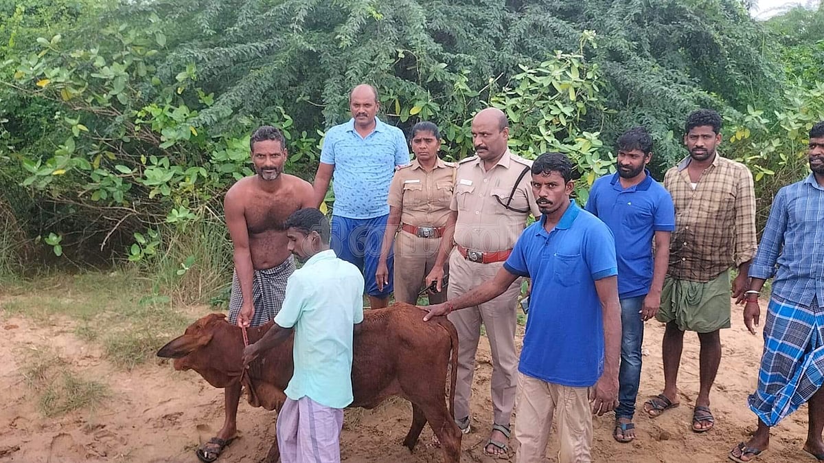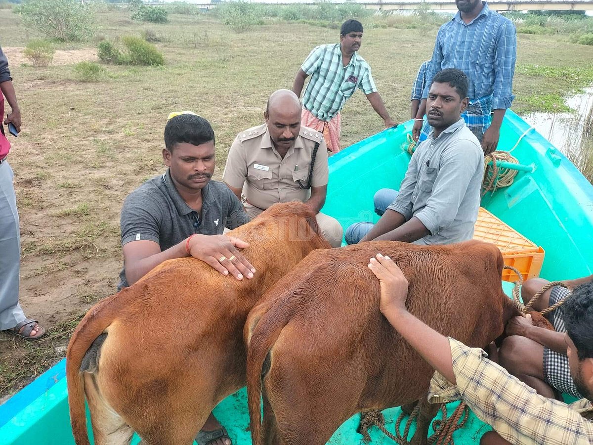 சீர்காழி அருகே கொள்ளிடம் ஆற்றின் திட்டில் மேய்ச்சலுக்கு சென்று சிக்கிக்கொண்ட 24 பசுமாடுகளை டி.எஸ்.பி லா மெக் தலைமையில் போலீசார் இன்று வெள்ளிக்கிழமை காலை படகுகள் மூலம் மீட்டனர்.