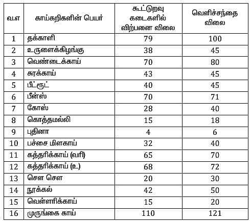 கூட்டுறவுத்துறை நடத்தும் பண்ணை பசுமை நுகர்வோர் கடைகள் மூலம் தக்காளி கிலோ ரூ.85/- ரூ.100/- வரை குறைவான விலையில் தரமாக பொதுமக்களுக்கு விற்பனை செய்ய முதற்கட்டமாக நாளொன்றுக்கு 15 மில்லியன் டன் தக்காளி மற்றும் இதர காய்கறிகள் கொள்முதல் செய்யப்பட்டு விற்பனை செய்யப்பட்டு வருகிறது. இன்று மதியம் வரை தோராயமாக 8 மில்லியன் டன் தக்காளி மற்றும் இதர காய்கறிகள் பண்ணை பசுமை நுகர்வோர் கடைகள் மூலம் பொதுமக்களுக்கு வெளிச்சந்தை விலையை விட குறைந்த விலையில் பின்வரும் விவரப்படி விற்பனை செய்யப்பட்டு வருகிறது.