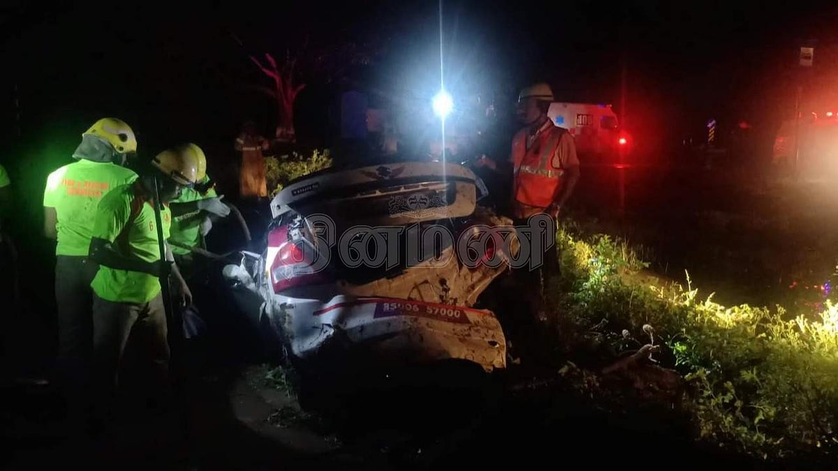 கோவில்பட்டி அருகே சாலையின் ஓரம் இருந்த மின்கம்பத்தில் மோதி அப்பளம் போல் நெருங்கி கிடக்கும் கார்.