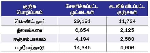 சென்னையில் வனத்துறை சாா்பில் அமைக்கப்பட்ட பொறிப்பகம் மூலம் கடந்த மூன்று மாதங்களில் 21,338 ஆலிவ் ரிட்லி ஆமைக் குஞ்சுகள் கடலில் விடப்பட்டுள்ளன.