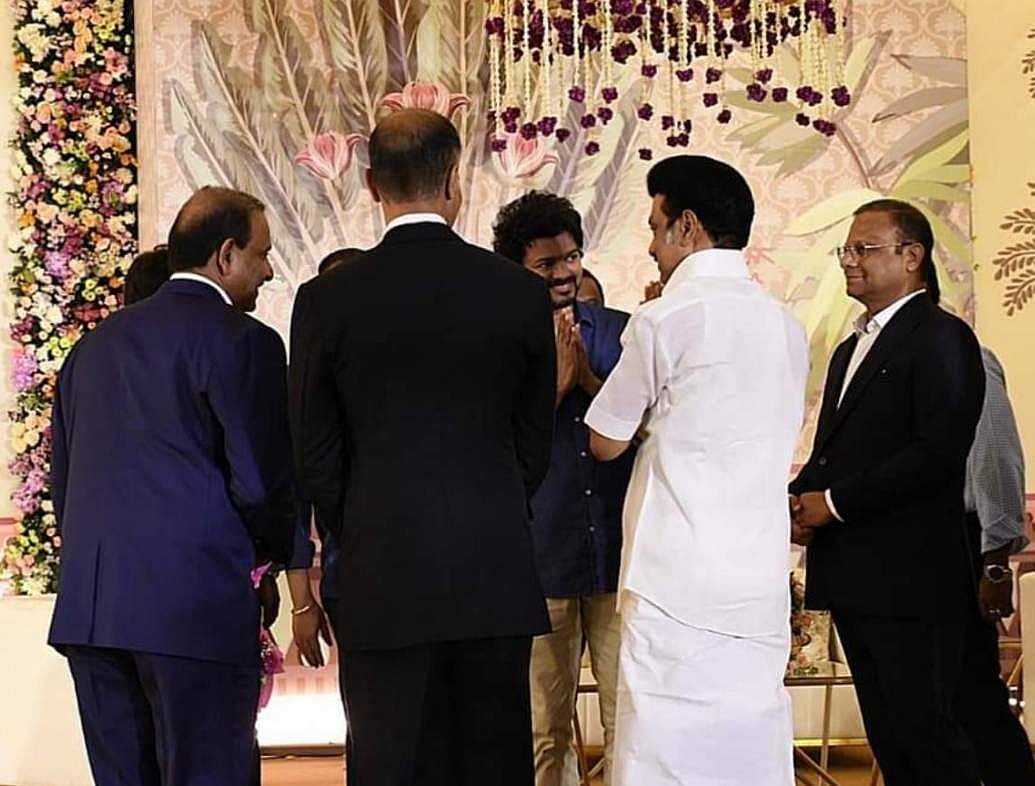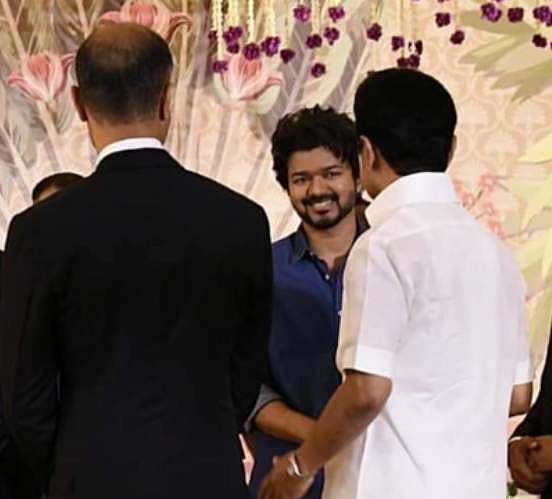 சினிமா தயாரிப்பாளர் இல்லத் திருமண வரவேற்பு நிகழ்ச்சியில் முதல்வர் மு.க.ஸ்டாலினும் நடிகர் விஜய்யும் நேரில் சந்தித்துக்கொண்டனர். நிகழ்ச்சியில் எதேர்ச்சையாக நடந்த இந்த சந்திப்பில் இருவரும் ஒருவரை ஒருவர் கைக்குலுக்கி நலம் விசாரித்துக்கொண்டனர்.