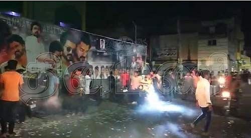 சேலம் ஏ. ஆர். ஆர். எஸ் மல்டிபிளக்ஸ் திரையரங்கின் முன்பு பட்டாசு வெடித்து மகிழ்ச்சியை வெளிப்படுத்திய விஜய் ரசிகர்கள்.