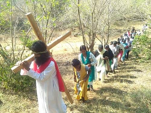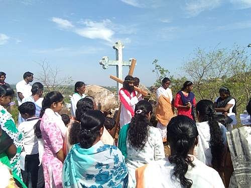 சிலுவையில் அறைந்த தினத்தை நினைவு கூறும் வகையில் செங்கல்பட்டு புலிப்பாக்கம் மலைக்கோயிலில் சிலுவையை சுமந்து கிராம மக்கள் ஊர்வலமாகச் சென்றனர்.