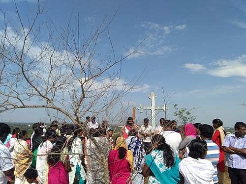 புலிப்பாக்கம் கிராமத்தில் உள்ள மலைக்கு சிலுவையை சுமந்து செல்லும் கிராம மக்கள்.