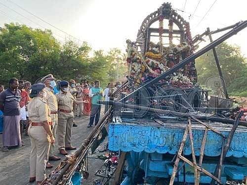 களிமேடு கிராமத்தில் அப்பர் சதய விழா தேர் திருவிழாவில் உயர் அழுத்த மின் பாதையில் சப்பரத்தின் உச்சிப்பகுதி உரசியதில் விபத்துக்குள்ளான தேர்.