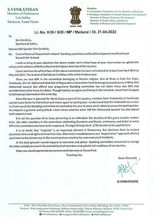 ரமலான் பெருநாளன்று நாடாளுமன்ற நிலைக்குழு பயணம் மேற்கொள்வது தேசத்தின் பன்மைத்துவ உணர்வை மதிக்கத்தவறும் போக்கு என்று சு.வெங்கடேசன் எம்.பி கண்டனம் தெரிவித்துள்ளார்.