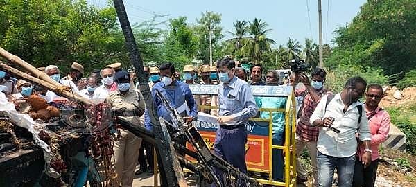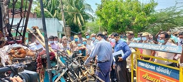 களிமேடு கிராமத்தில் விபத்துக்குள்ளான தேரை பார்வையிடும் விசாரணைக் குழு அலுவலர் குமார் ஜெயந்துடன் ஆட்சியர் தினேஷ் பொன்ராஜ் ஆலிவர்.