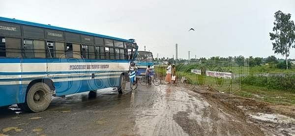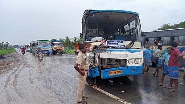 சீர்காழி புறவழிச்சாலையில் நேருக்கு நேர் மோதி விபத்துக்குள்ளான புதுச்சேரி அரசு பேருந்தும், தமிழக அரசு பேருந்தும்.