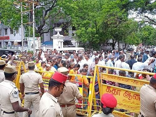 இந்நிலையில், 4-ஆம் நாளான வியாழக்கிழமை 12.30 மணியளவில் மாவட்ட ஆட்சியர் அலுவலகத்தை முற்றுகையிட்டு போராட்டம் நடத்தினர். ஆட்சியரகத்துக்கு செல்ல முடியாத வகையில் போலீசார் தடுப்புகளை அமைத்திருந்ததால், அங்கேயே மறியலில் ஈடுபட்டனர்.