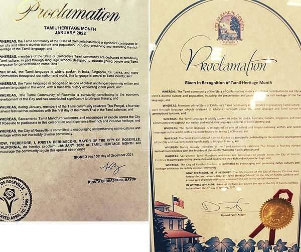 குறிப்பாக கலிஃபோர்னியா மாகாணத்தில் தமிழகத்தில் இருந்து புலம்பெயர்ந்தோர் சுமார் 60,000 பேர் வசிக்கின்றனர். அவர்களுக்காகவும், தமிழின் சிறப்பை அங்கிருப்பவர்களை அறியச் செய்யும் வகையிலும் சாக்ரமென்டோ தமிழ் மன்றம் செயல்படுகிறது. இம்மன்றம் பரிந்துரைத்தலின்பேரில், ஜனவரி மாதம், தமிழ் பாரம்பரிய மாதமாக கலிஃபோர்னியா மாகாணத்தின் முக்கிய நகரங்களான போல்சோம், ரோஸ்வில், ராக்லின், ரான்சோகோர்டோவா ஆகியவற்றின் மேயர்களால் பிரகடனம் செய்யப்பட்டுள்ளது.