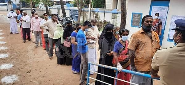 மன்னார்குடி எம் ஜி ஆர் நகர் வாக்குச் சாவடியில் வரிசையல் நிற்கும் பெண்கள்.