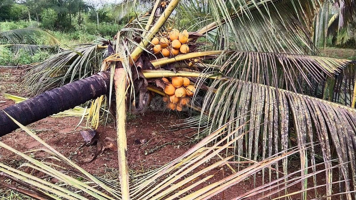 யானைகள் சேதப்படுத்தியதில் வேரோடு சாய்ந்த தென்னை.