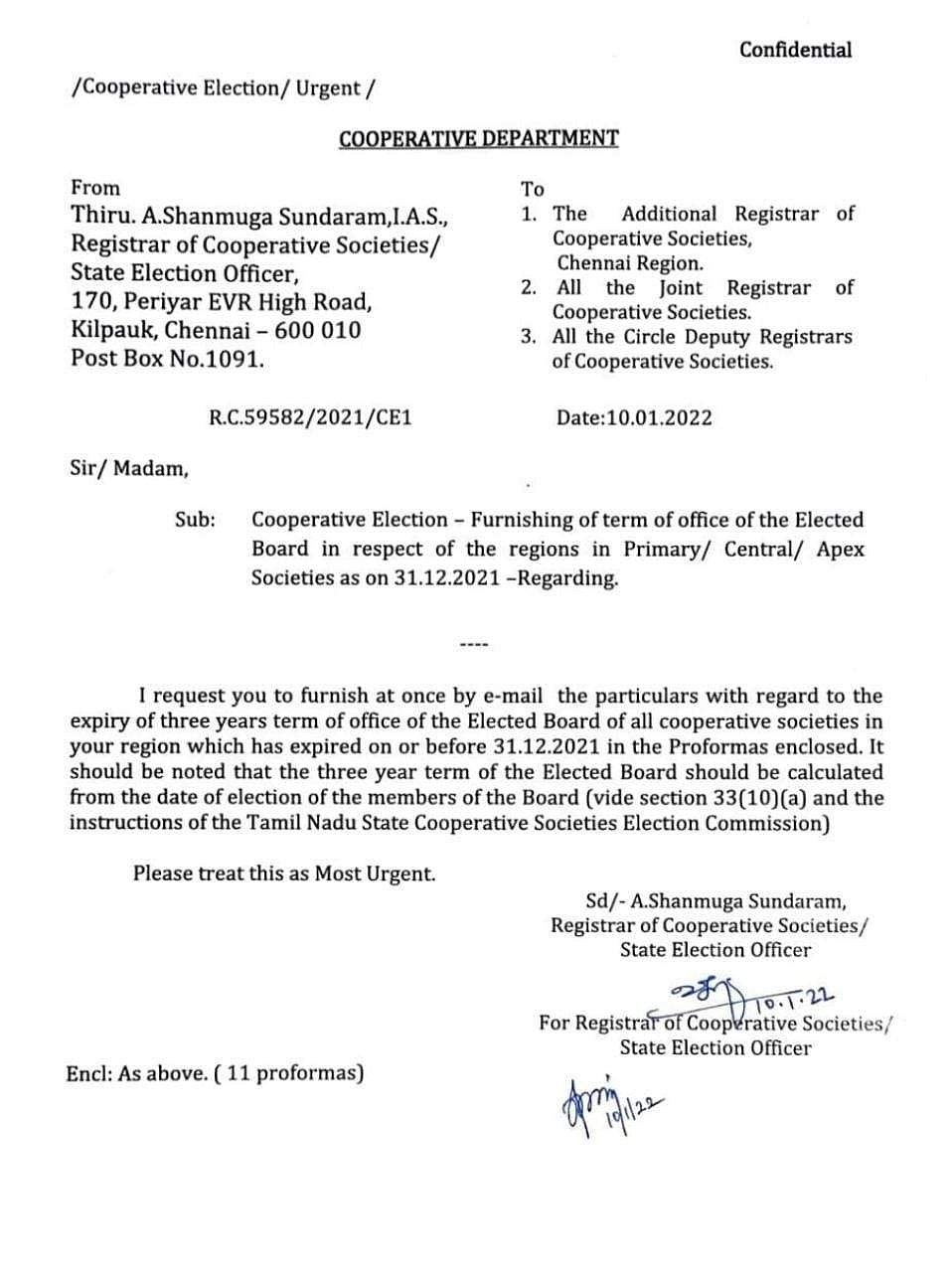 இது தொடர்பாக கூட்டுறவு சங்க தேர்தல் அலுவலர் வெளியிட்டுள்ள அறிக்கையில், அனைத்து வகை கூட்டுறவு சங்கங்களின் பதவிக்காலமும் டிசம்பர் 31-ஆம் தேதியுடன் முடிவடைகிறது.