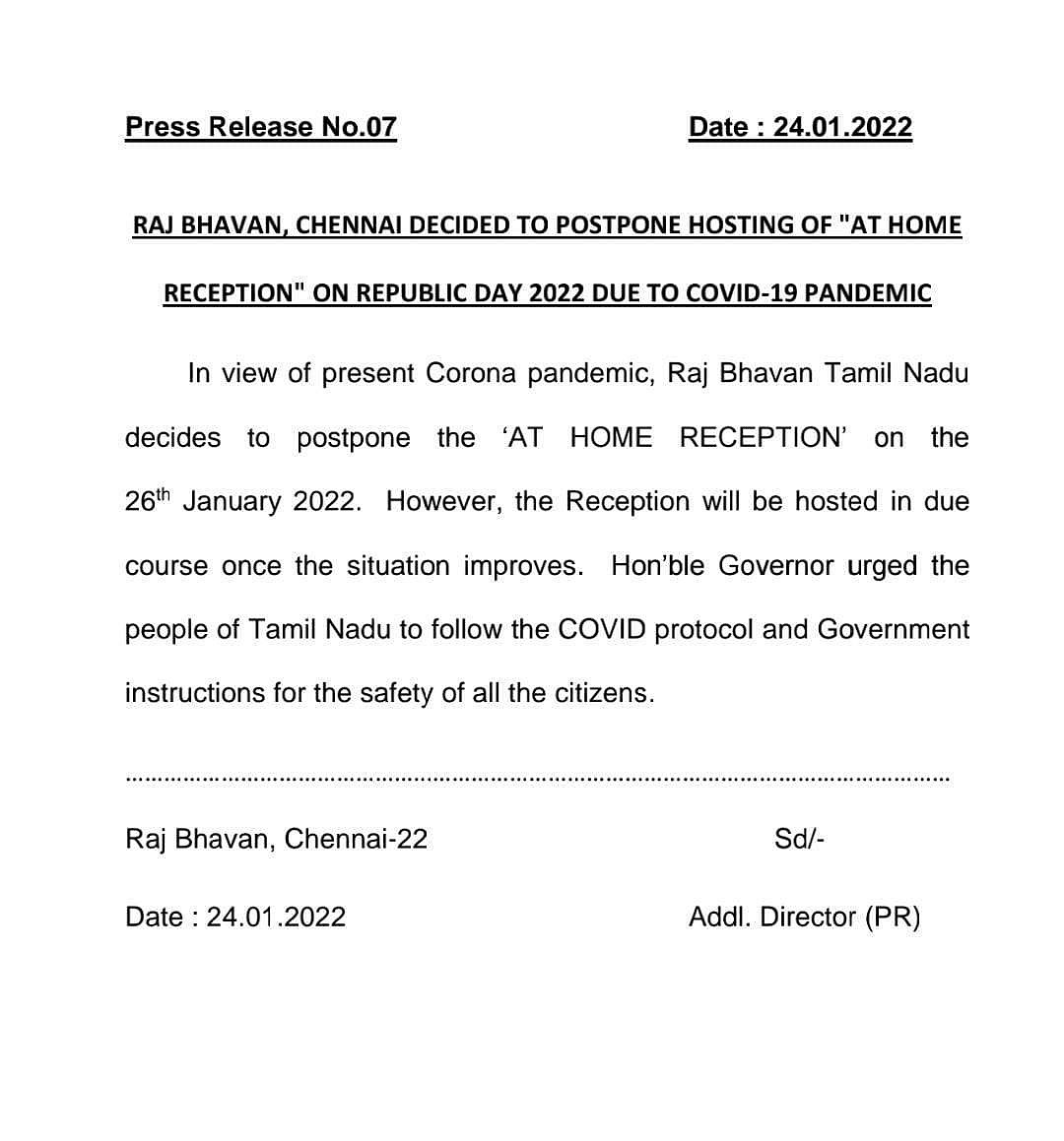 கரோனா தொற்றுப் பரவல் காரணமாக, வரும் ஜனவரி 26 ஆம் தேதி குடியரசு தினத்தன்று ஆளுநர் மாளிகையில் நடைபெறவிருந்த தேநீர் விருந்து ஒத்திவைக்கப்படுகிறது.