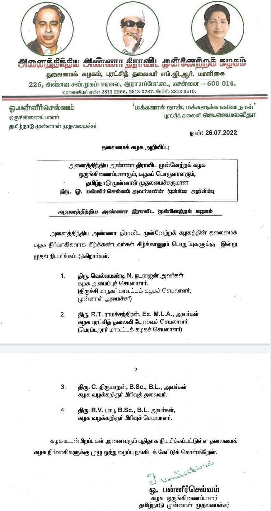 இந்நிலையில், வெல்லமண்டி நடராஜன் உள்பட நான்கு பேரை அதிமுக தலைமைக் கழக நிர்வாகிகளாக நியமித்து ஓ.பன்னீர் செல்வம் அறிவிப்பு வெளியிட்டுள்ளார்.