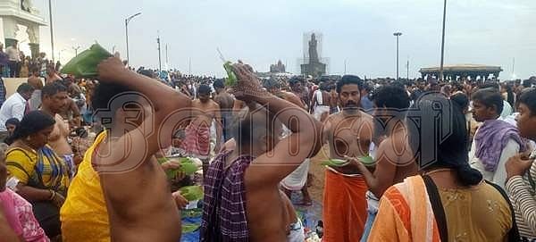 ஆடி அமாவாசையை முன்னிட்டு கன்னியாகுமரி முக்கடல் சங்கமத்தில் குவிந்த பக்தர்கள்.